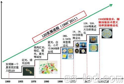 20世纪初第一个具有实际意义的LED被发明出来,但因其亮度无法达到应用要求,没有被广泛使用,直到20世纪70年代末红绿光LED出现,特别是80年代橙光、黄光等相继诞生后,LED才逐渐得到广泛使用。